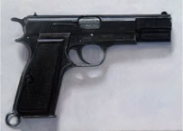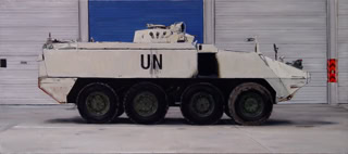 Pistols are painted at a scale that reveals every detail of how they are made and yet they are viewed by the artist straight on, on a white background as if they posed no threat. The massive machine gun paintings make us admire their precision engineering without thinking immediately of their purpose. Even the UN armored personnel carrier looks quite calm in it's static position. Smith has created a wonderful juxtaposition for us, these tools for killing are presented in a calm and objective way - they even look beautiful. It leads us to look at them in an abstract way first before considering what they are really for.